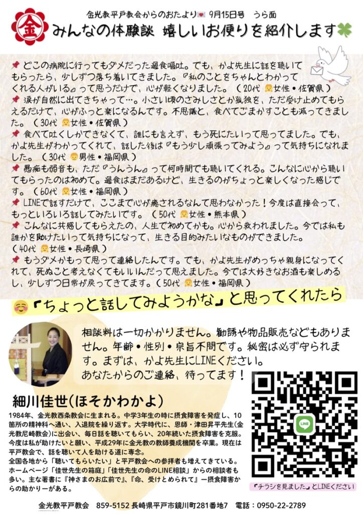 1984年、金光教西条教会に生まれる。中学3年生の時に摂食障害を発症し、10箇所の精神科へ通い、入退院を繰り返すが症状は悪化する一方。大学時代に、命の恩人である取次師の先生に出会い、そのお取次によって20年続いた摂食障害を克服。助けていただいた命は、人助けのために使っていただきたいと願い、恩師と同じ取次師の道を志す。平成29年に金光教学院(教師養成機関)を卒業。お取次により助けられてきた経験を基に、現在は平戸教会でお取次の御用に専念。全国各地から、そのお取次をいただきたいと平戸教会への参拝者も増えてきている。ホームページ「佳世先生の箱庭」「佳世先生の命のLINE相談」からの相談者も多い。