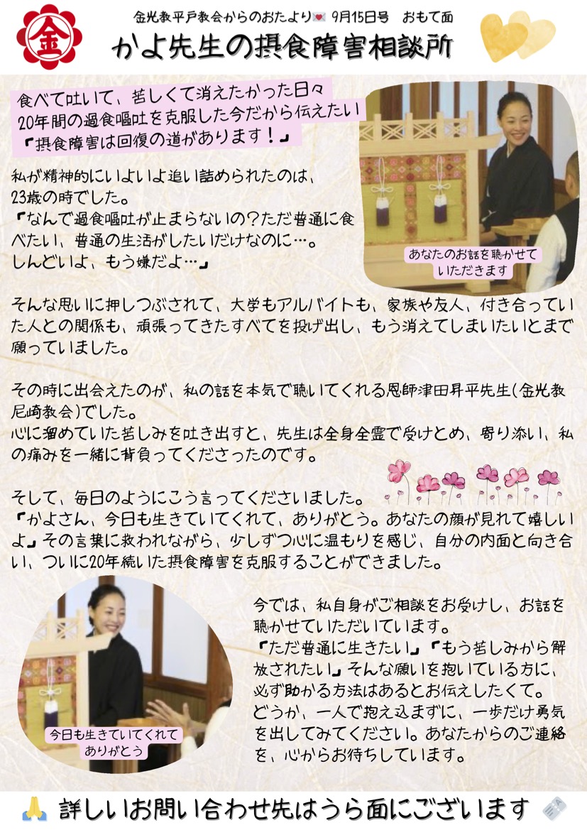 1984年、金光教西条教会に生まれる。中学3年生の時に摂食障害を発症し、10箇所の精神科へ通い、入退院を繰り返すが症状は悪化する一方。大学時代に、命の恩人である取次師の先生に出会い、そのお取次によって20年続いた摂食障害を克服。助けていただいた命は、人助けのために使っていただきたいと願い、恩師と同じ取次師の道を志す。平成29年に金光教学院(教師養成機関)を卒業。お取次により助けられてきた経験を基に、現在は平戸教会でお取次の御用に専念。全国各地から、そのお取次をいただきたいと平戸教会への参拝者も増えてきている。ホームページ「佳世先生の箱庭」「佳世先生の命のLINE相談」からの相談者も多い。